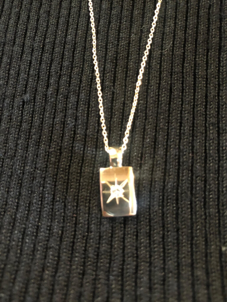 I came home, unloaded groceries, sent a few emails, made lasagna for that night, and then visited the bathroom before a scheduled Zoom call at 8:30. As I glanced in the mirror, I was HORRIFIED to see that the pendant was gone!